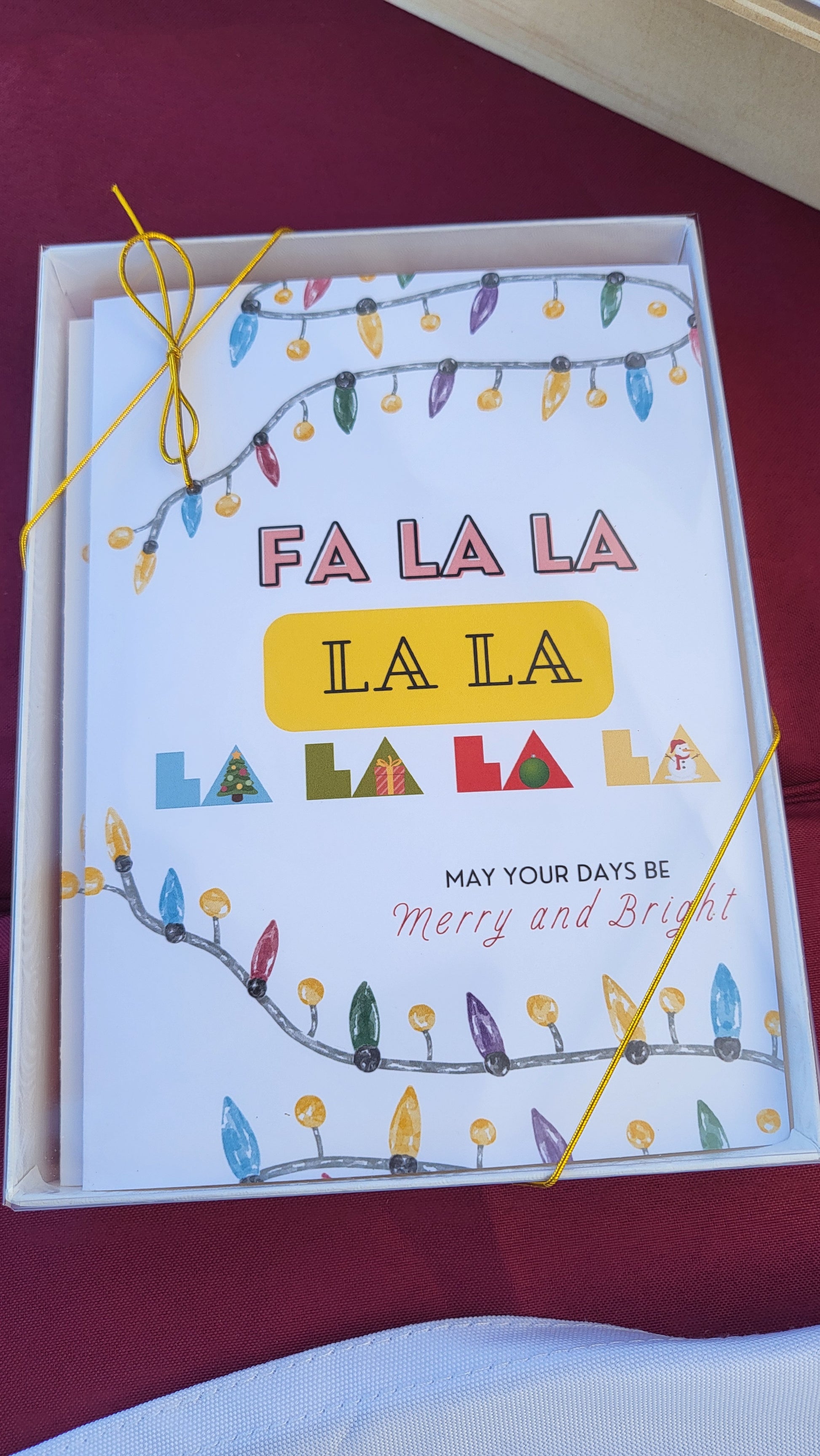 Set of 4 with envelopes. Bring some seasonal cheer to your family and friends with Christmas greetings! Our Fa La La card is sure to put a festive smile on your recipient's face! With merry colors, nostalgic lights and fun design, you can spread that warm and cozy feeling of the holiday season. Fa La La – Christmas is here!