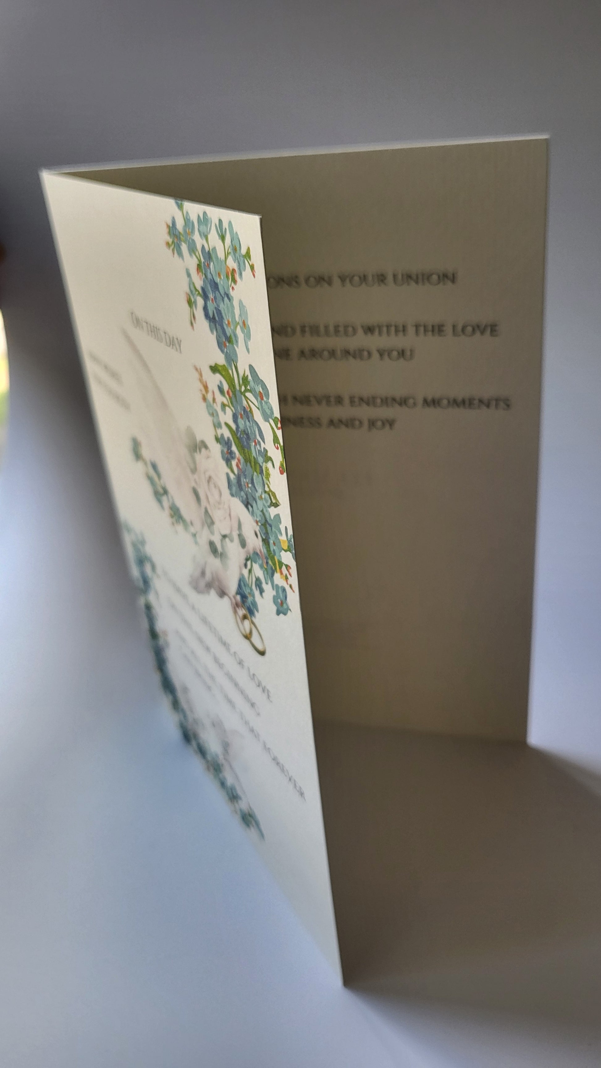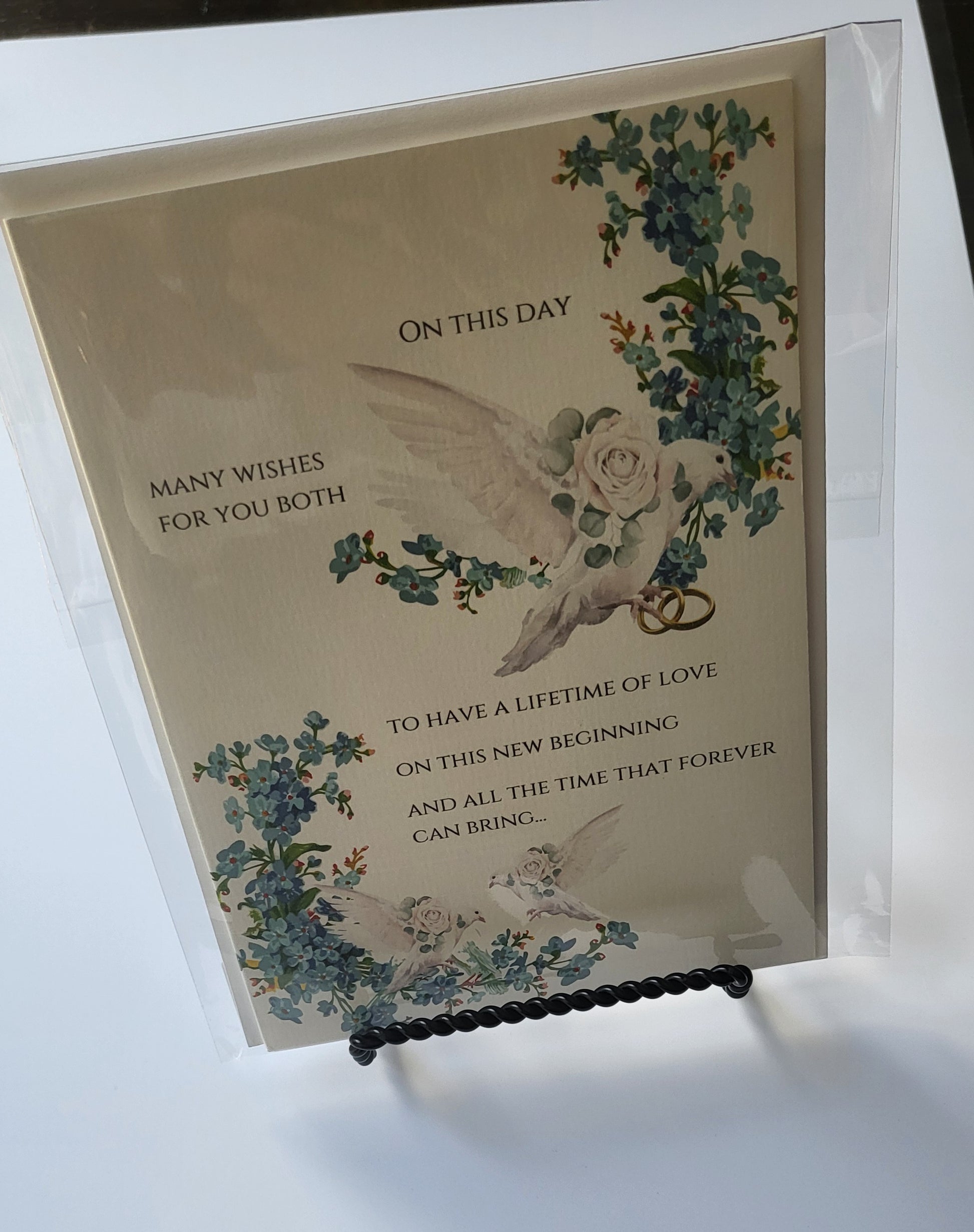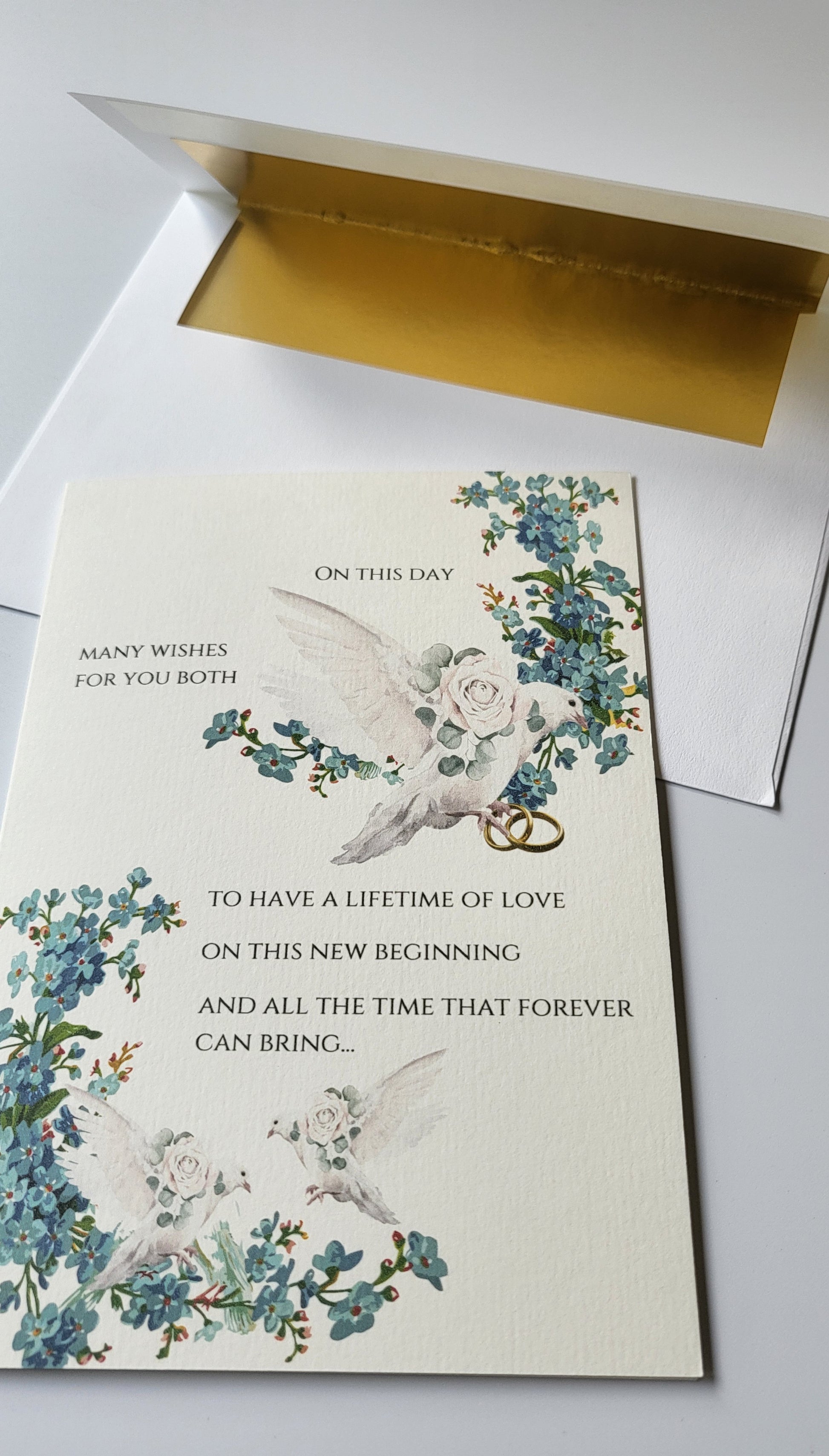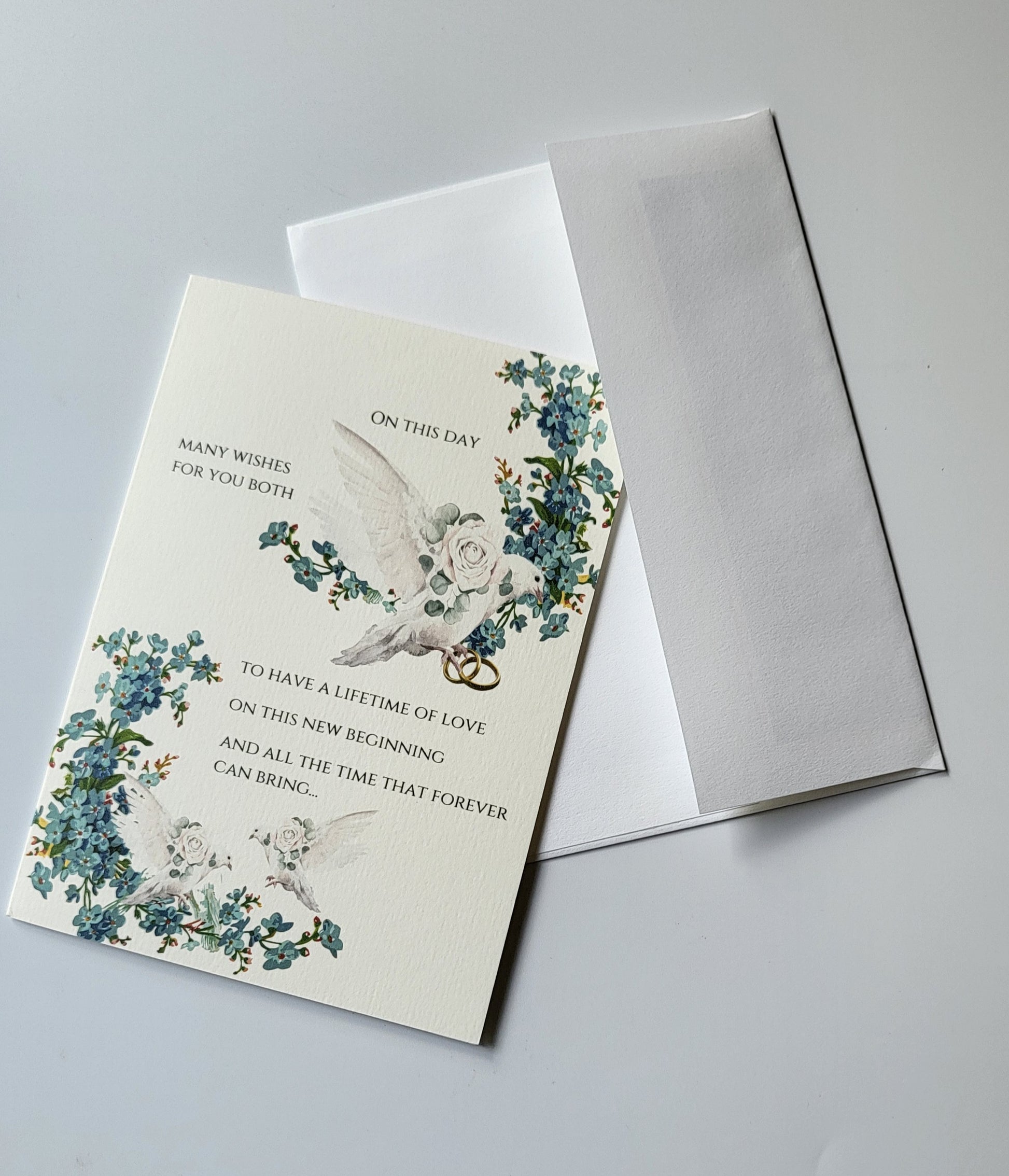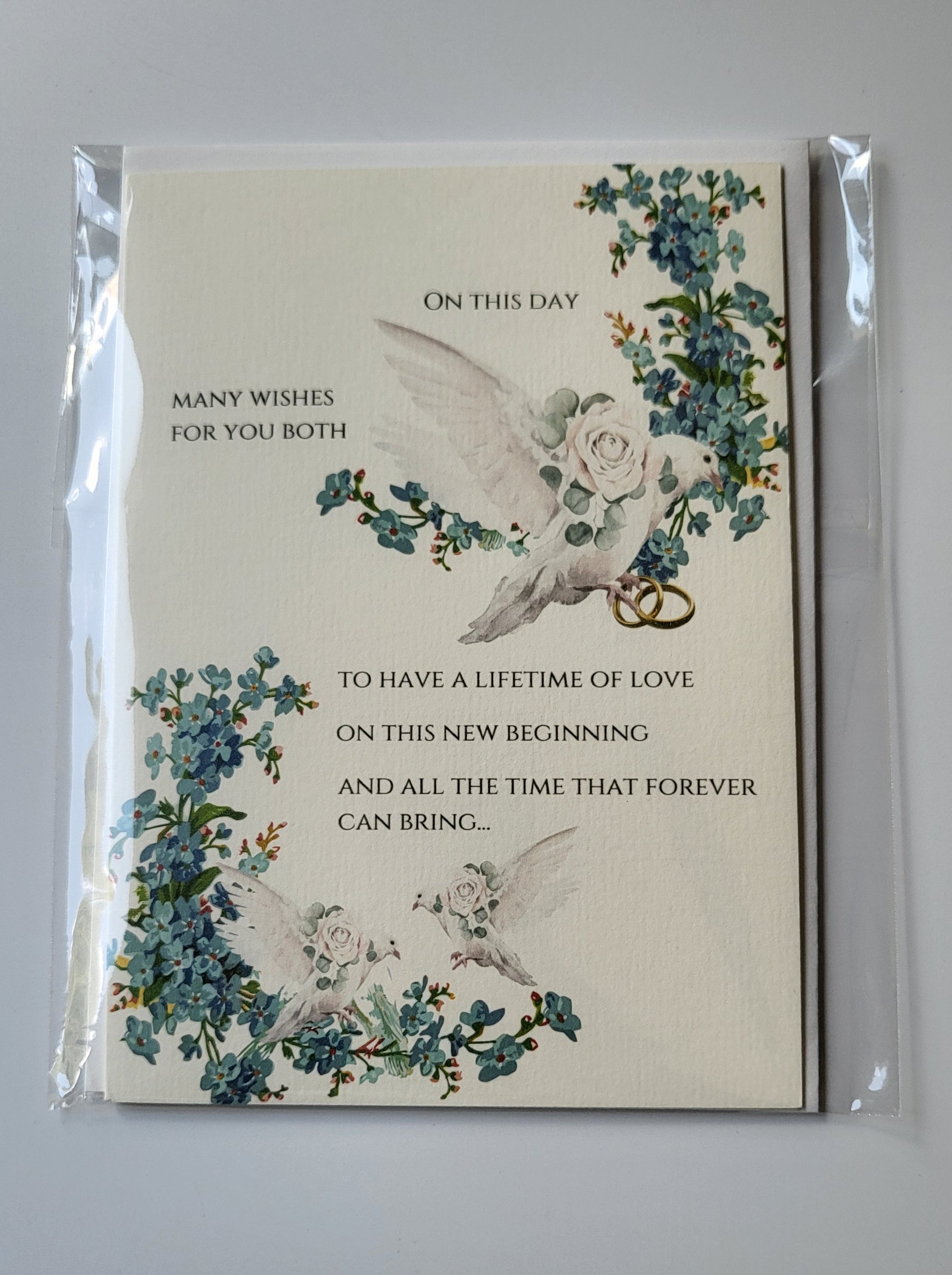 Celebrate the union of eternal love with the Lifetime of Love Wedding Card. Featuring graceful doves symbolizing a journey of companionship, intertwined wedding bands signifying everlasting commitment, and delicate greenery showcasing elegance and marital bliss. Share your well wishes in a timeless and meaningful way with this beautiful card. Envelope Included.