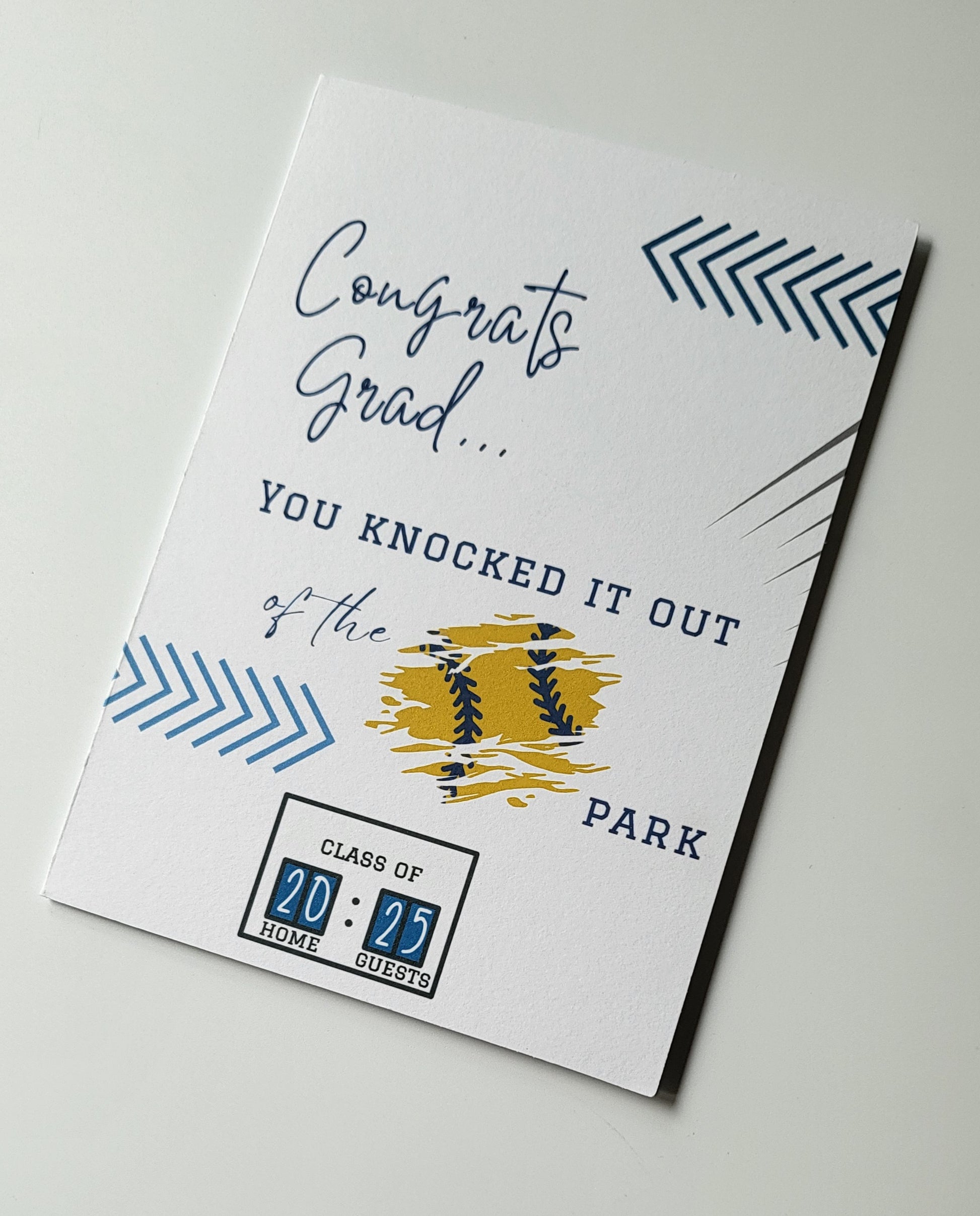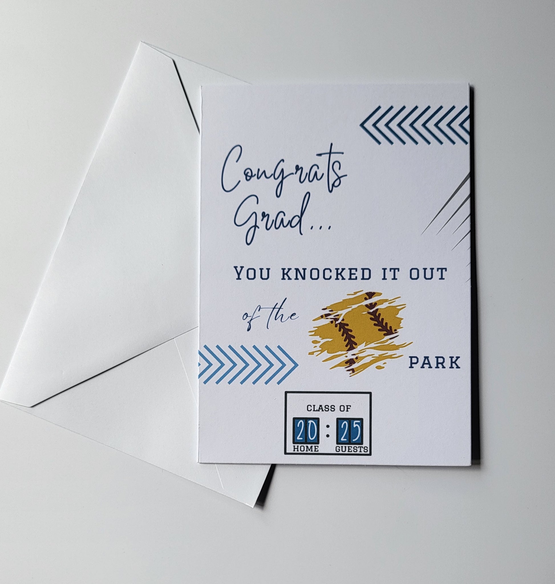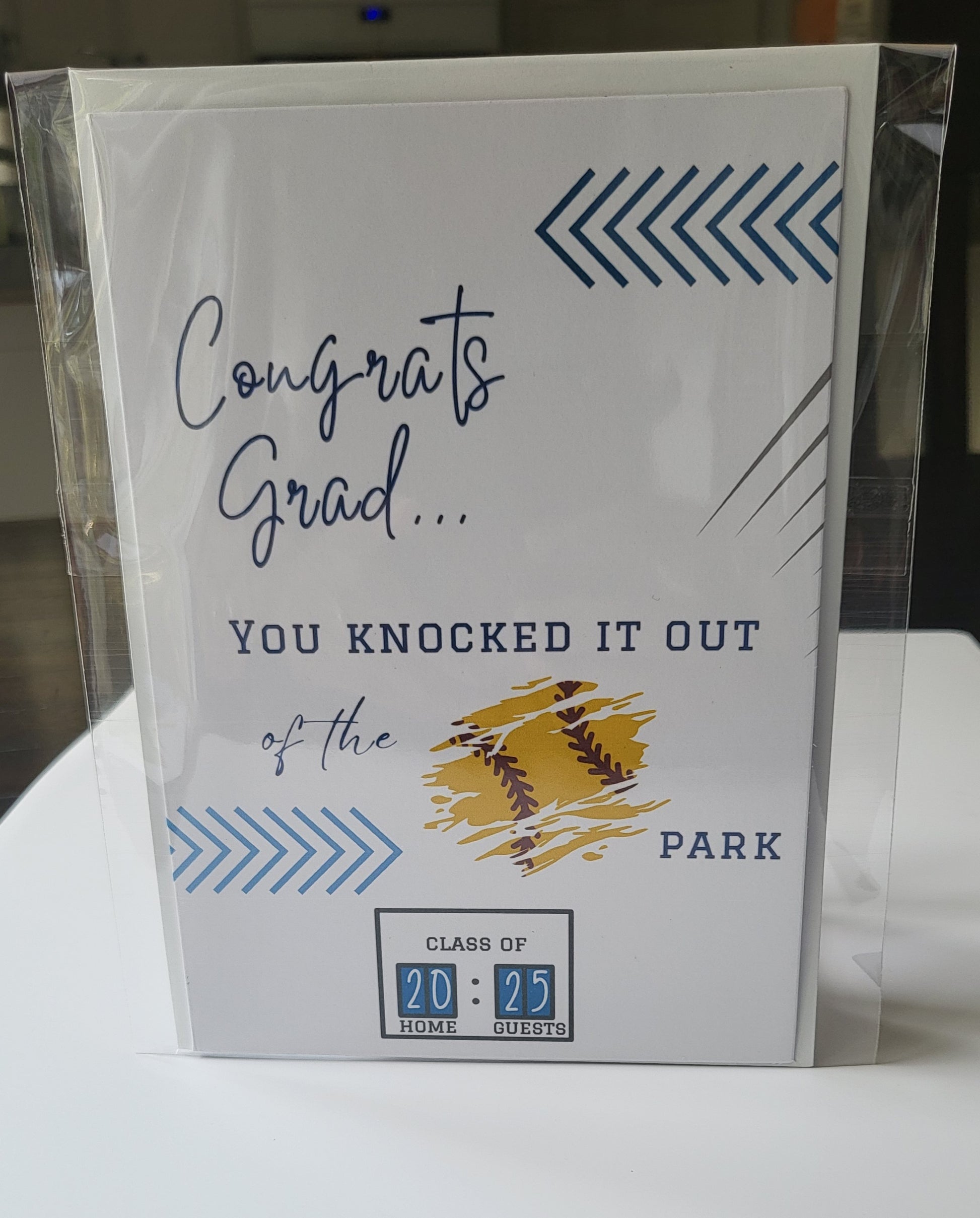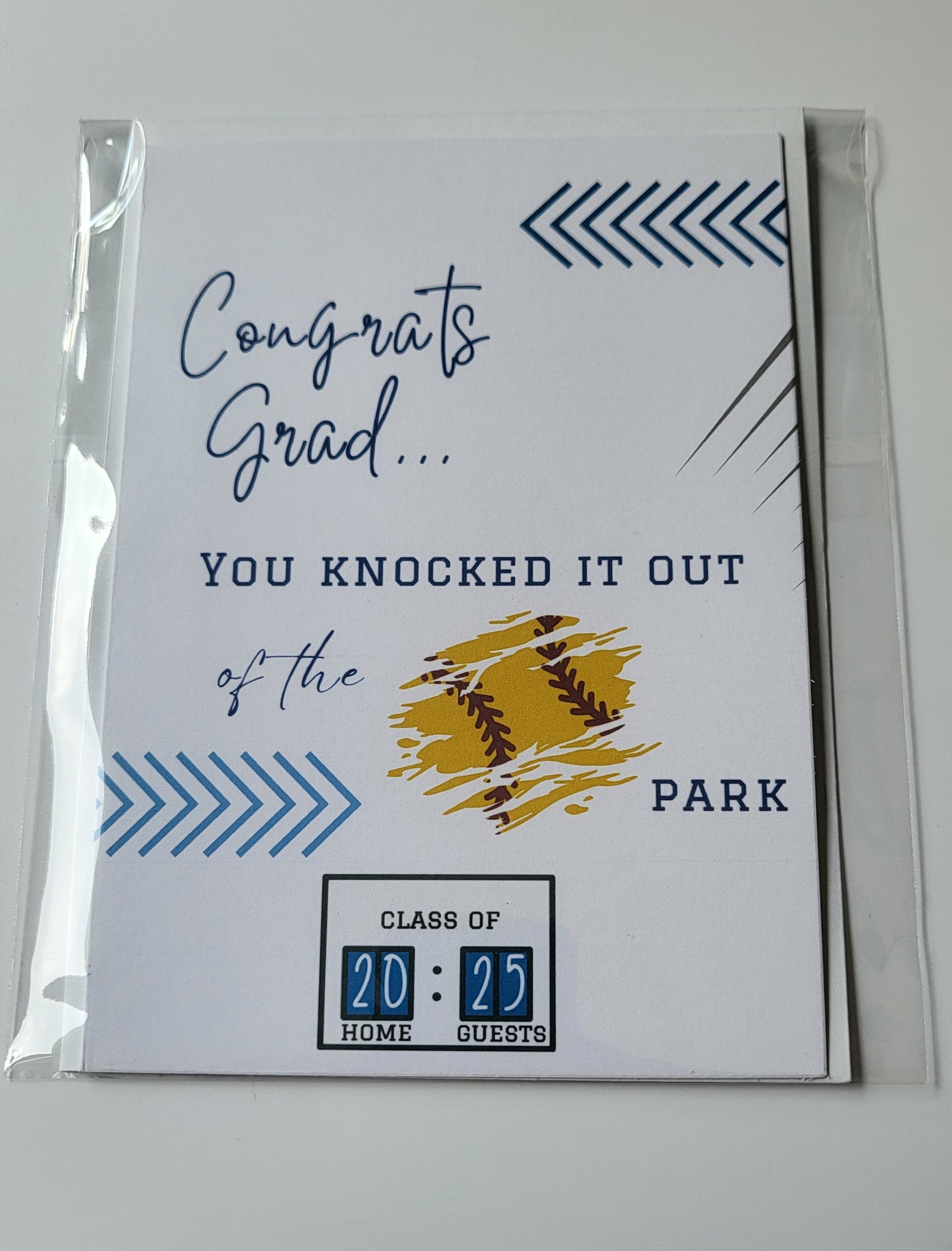 Batter up! This celebratory graduation card is a sport-themed design showcasing a love for the game while congratulating on their achievement. Show your support for the graduate with this unique and fitting card. Envelope Included.