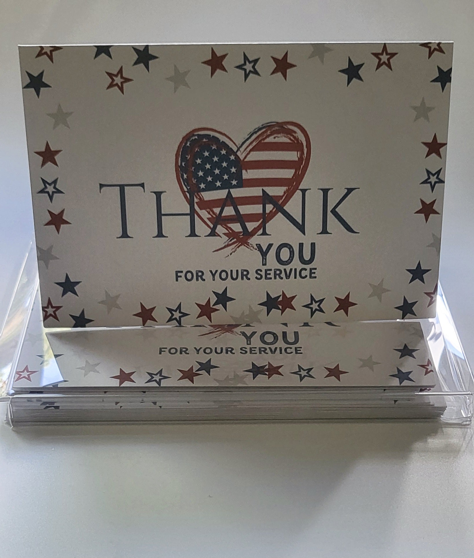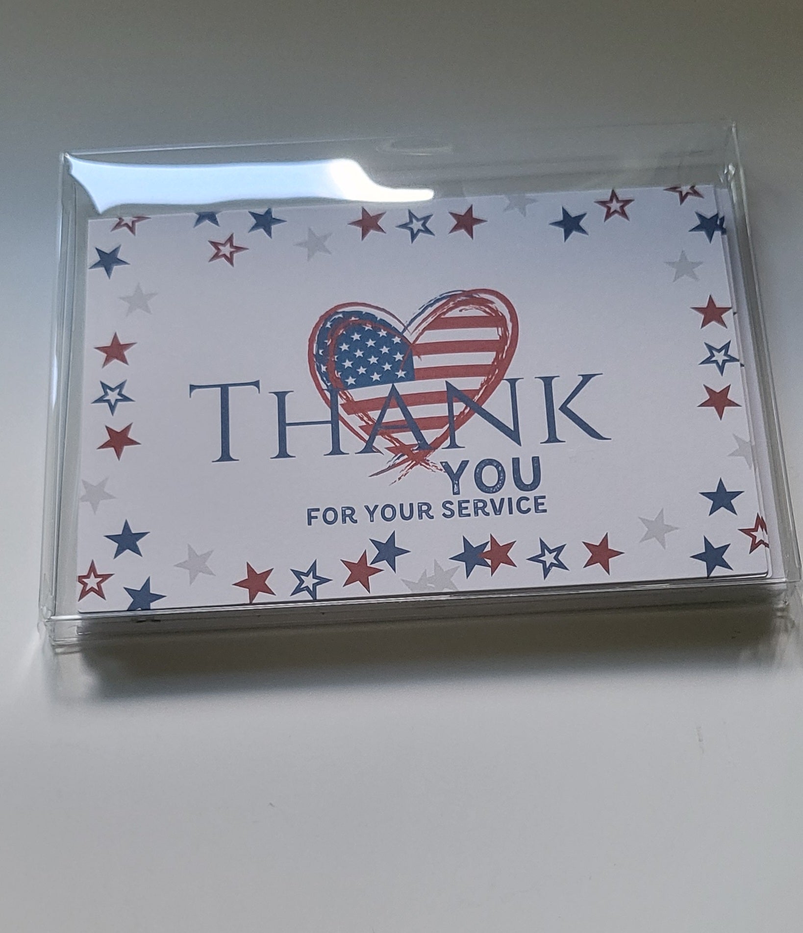 These patriotic folded notecards are the perfect way to say thank you for their service. With a bold red, white, and blue design, these notecards will make a heartfelt of thanks statement. Show your appreciation with these hand-crafted folded notecards. Set of 10. Envelopes Included.